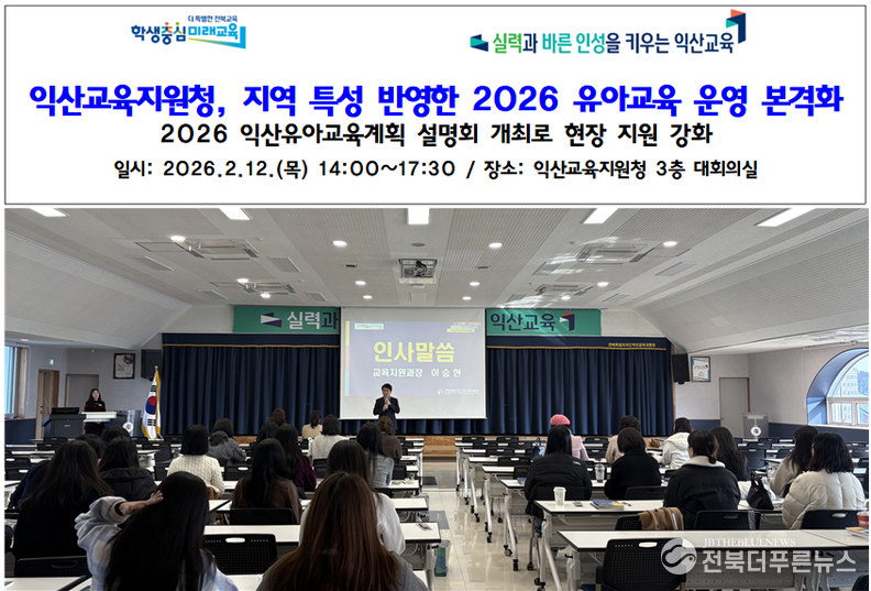 [전북더푸른뉴스 김혜진 기자]○ 익산교육지원청(교육장 정성환)은 관내 공·사립유치원 교원을 대상으로 「2026 익산유아교육계획 설명회」를 12일 익산교육지원청 대회의실에서 개최했다.